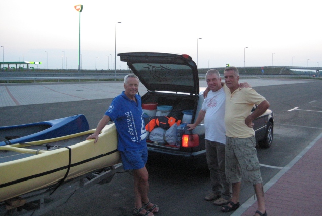 Zoli – Sanyi – Endre csomagfelvétele, majd Vizi Attilától utánfutóval a kenuk átvétele. 8 órakor indulás Fajesz Audi 100-val az autópályán .